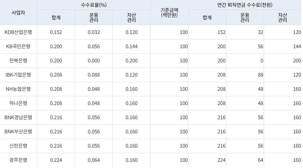 은행은 많지는 않지만 운용관리와 자산관리 수수료가 붙습니다. 24년 4분기 1억을 예치 시 나타내는 표입니다. KDB산업은행이 수수료율이 가장 적은 편이었고 제주읂앵이 가장 높았습니다.