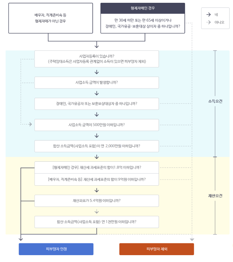 - 소득/재산요건을 충족하는 형제자매 중 미혼으로 65세 이상, 30세 미만, 장애인, 국가유공/보훈보상대상자 등