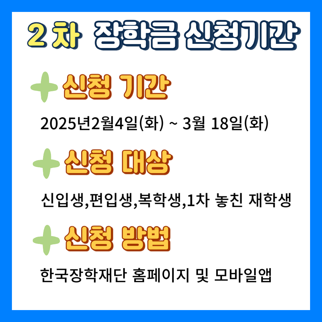 국가 장학금 2차를 놓치면 지원을 받을 수 없으니 꼭 신청기간과 구간을 잘 확인하시고 신청하시기를 바랍니다. 문의사항은 한국장학재단 상담센터(1599-2000)에서 상담하실 수 있습니다.