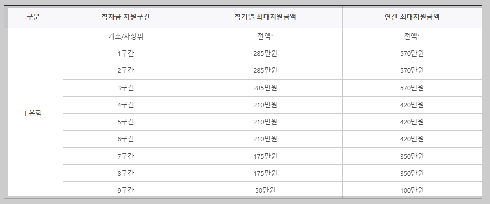 ✅ 1,2,3구간은 학기별 285만 원 연간 최대 570만 원을 지원합니다.