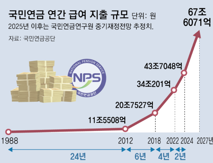 2025년 이후에 국민연금 연구원 추정치입니다. 올해 제도 도입 후 처음으로 월 4조원을 넘었습니다. 국민연금 보험료를 내는 사람은 줄어들고 연금을 받는 사람은 늘었기 때문입니다. 올해 지출액이 50조 원이 넘을 듯 예상하고 있습니다.