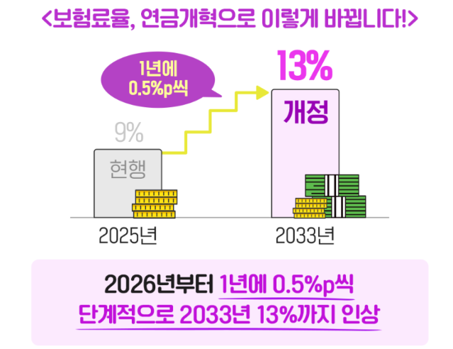 지난 3월에는 국민연금의 지속 가능성을 높이기 위해 2007년 이후 18년 만에 국회 본회의를 통과했습니다. 더내고 더 받는다는 취지입니다. 소득대체율을 9%에서 13%로 증가시켰고, 소득 대체율을 현행 40%에서 43%로 상향하기로 했습니다. 바로 시행하는 것이 아니라 내년부터 8년간 매년 0.5%씩 2033년까지 총 4% p를 인상할 계획에 있습니다.