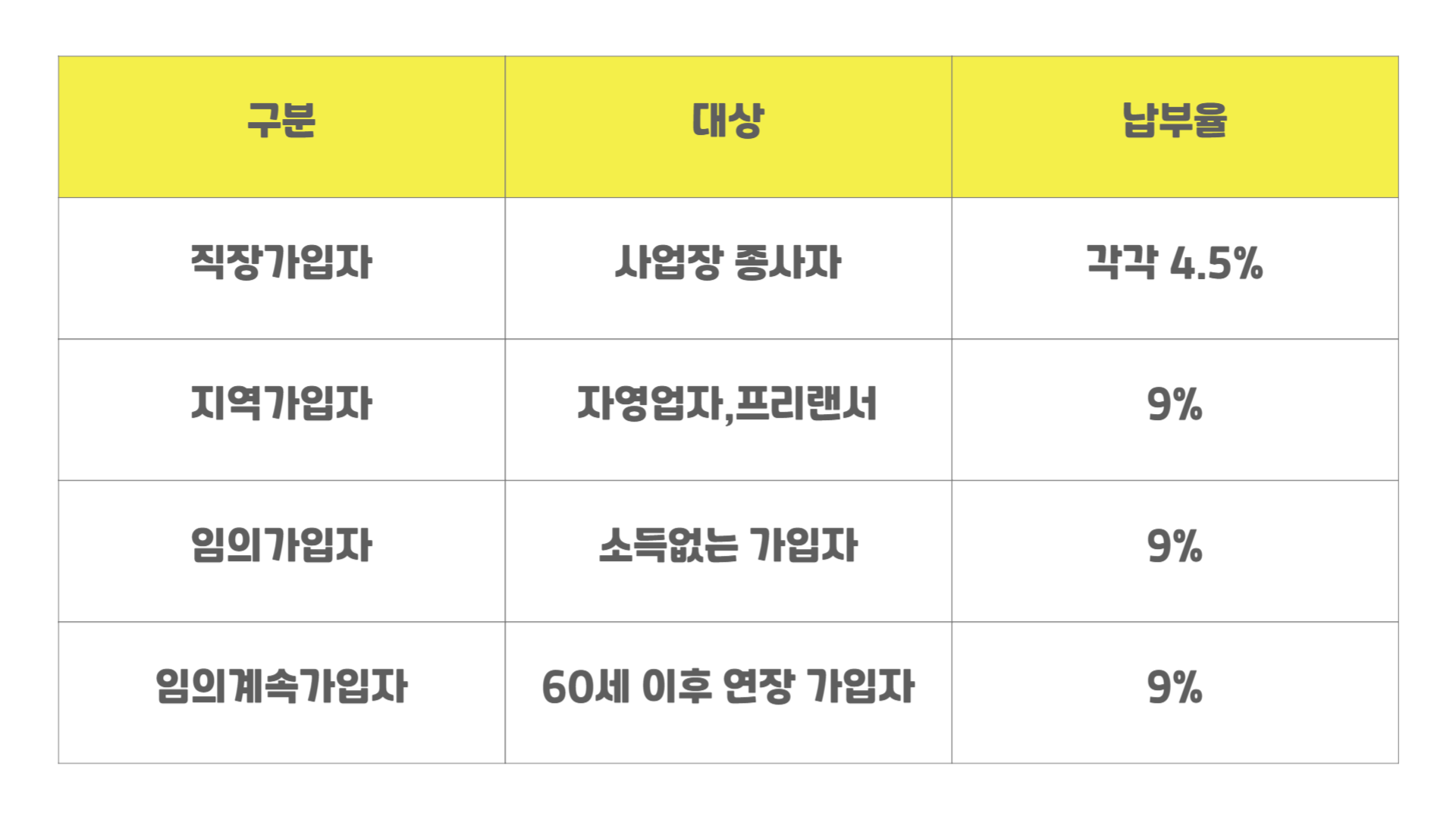 - 가입자 유형으로 직장가입자/지역가입자로 나뉩니다. 또한 신청에 의한 임의가입자/임의계속가입자로 분리가 됩니다.