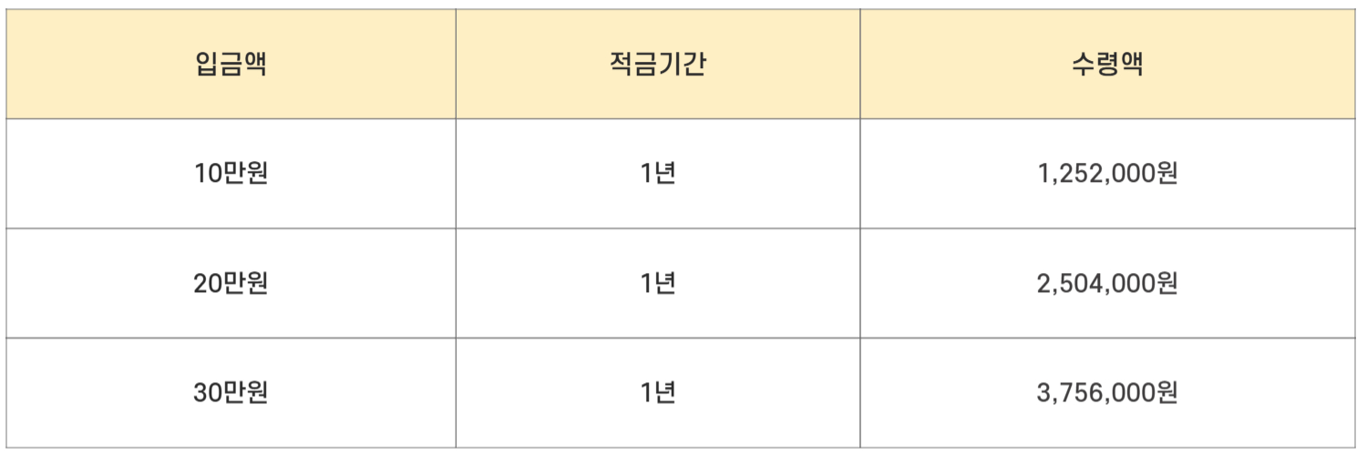 ◾ 월 100,000만원 씩 12개월 간 8% 금리로 입금했을 시에는 만기금액 1,252,000원입니다.
