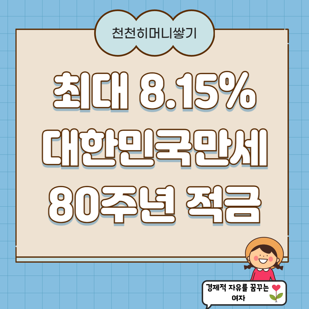 하나은행에서 아주 뜻깊은 적금이 나왔습니다. 2025년에는 광복 80주년이 되는 해입니다. 하나은행에서는 특별한 의미를 담아 '대한민국만세 80주년 적금'을 출시하였습니다. 최대 8.15%의 금리를 가져갈 수 있다고 하니 저금리 시대에 좋은 적금이 아닐 수 없습니다. 이번포스팅에서는 내가 실질적으로 받을 수 있는 금리가 얼마나 되는지 확인해 보도록 하겠습니다. 뜻깊은 적금 하나쯤 갖는 것도 좋은 뜻이 되지 않을까 합니다.