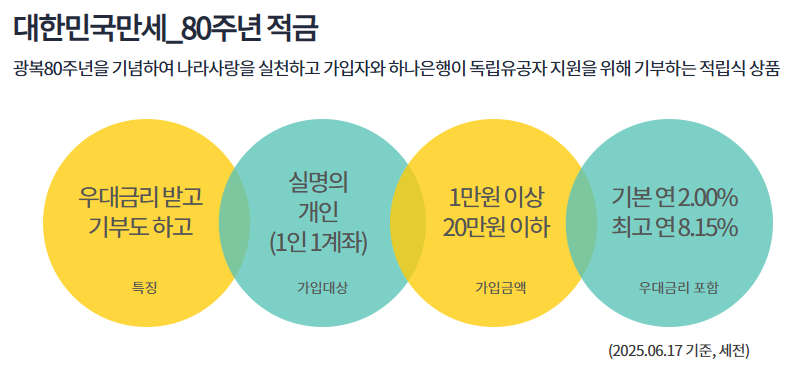 광복 80주년을 기념하여 나라사랑을 실천하고 가입자와 하나은행이 독립유공자 지원을 위해 기부하는 적립식 상품입니다.