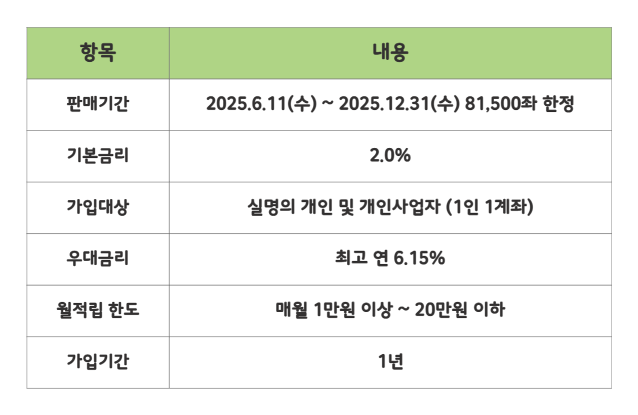 👉 광복 80주년 탄생둥이 : 2025년 광복 80주년에 출생한 신생아 및 부모인 경우 연 2.00%를 받습니다.