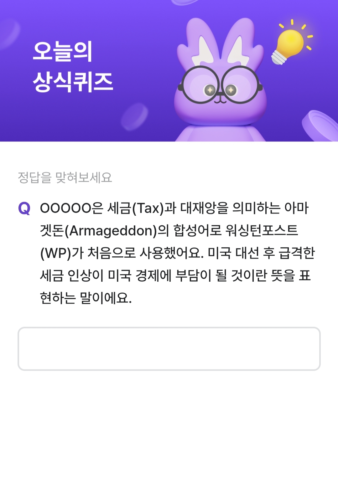 Q : OOOOO은 세금(Tax)과 대재앙을 의미하는 아마겟돈(Armargeddon)의 합성어로 워싱턴포스트(WP)가 처음으로 사용했어요. 미국 대선 후 급격한 세금 인상이 미국 경제에 부담이 될 것이란 뜻을 표현하는 말이에요'