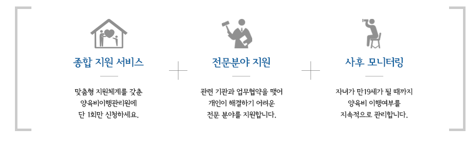 양육비 이행 지원 서비스는 양육부모의 신청을 받아 양육비를 지급받을 수 있도록 지원하는 서비스입니다. 필요한 서비스를 지원받기 위해 각각의 단계마다 서비스를 찾아갈 필요 없이 1회 신청만으로 종합지원 서비스가 가능합니다.