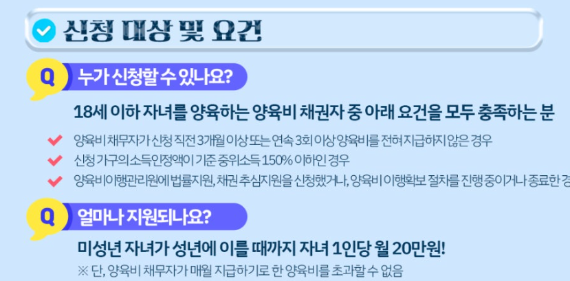 ✅ 정기적으로 양육비 지급할 의무가 있는 채무자가 신청한 날이 속한 달의 직전 3개월 또는 직전 달 마지막 날까지 연속하여 3회 이상 양육비를 전혀 이행하지 않은 경우