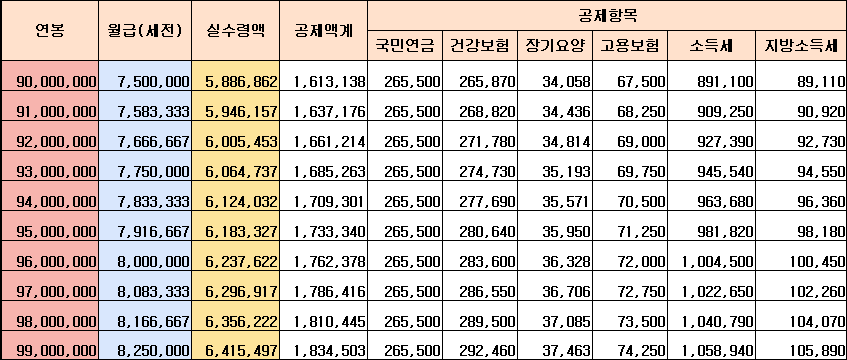 연봉 9,000만 원 ~ 9,900만 원 연봉과 실수령액표입니다.