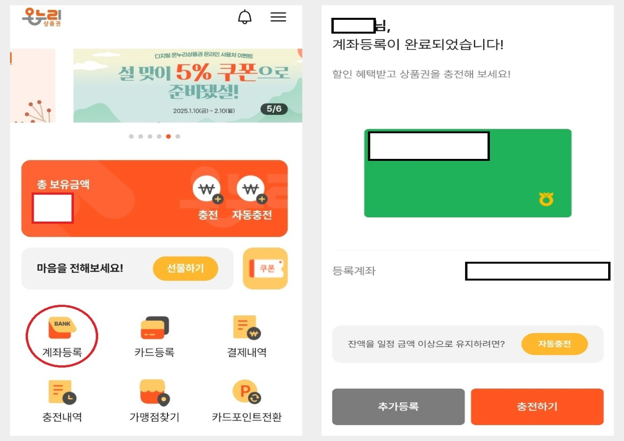 - 온누리 상품권 메인 홈에서 '충전'을 선택 후 본인 계좌 충전합니다.