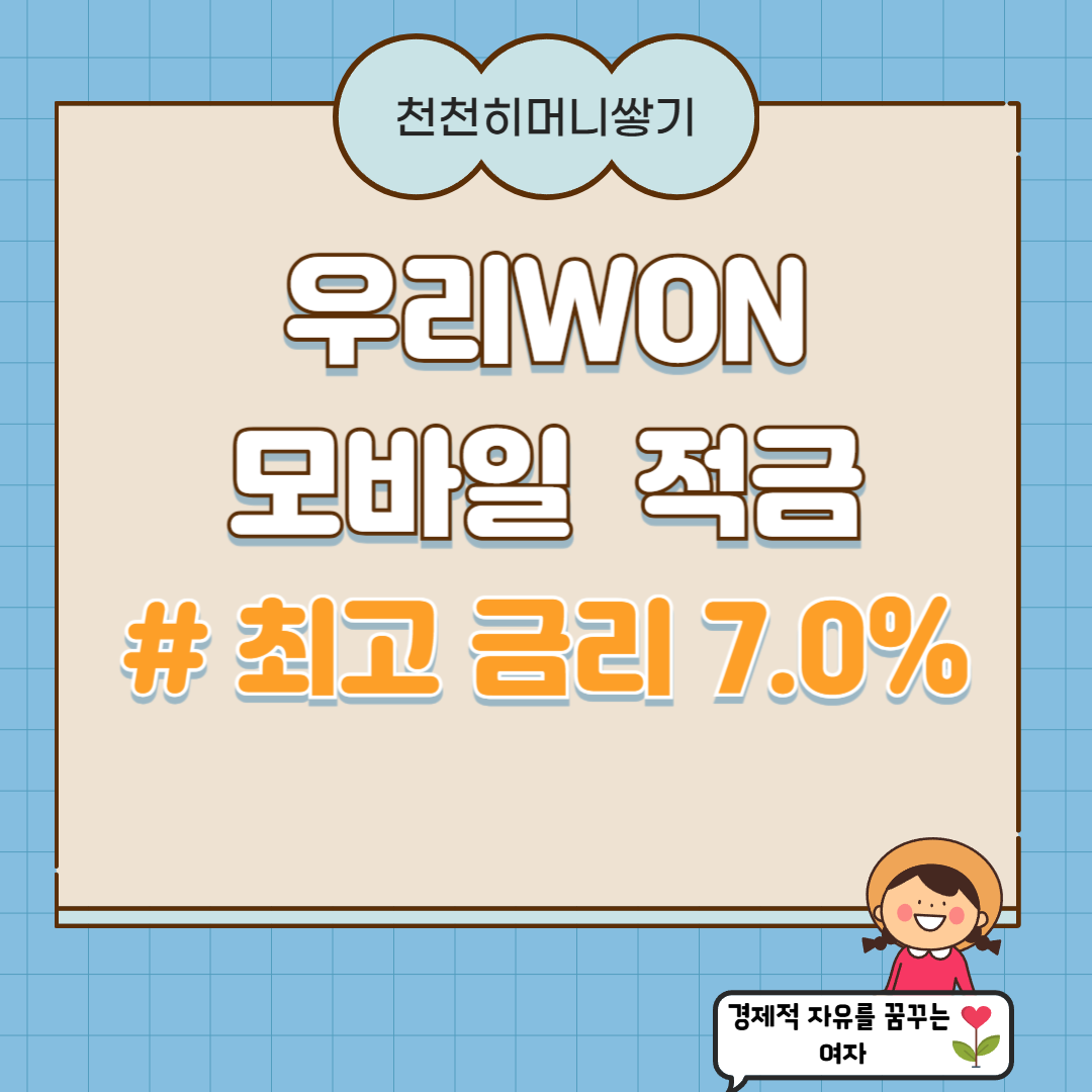 최근에는 5대 시중은행에서 요구불예금이 15조원 가까이 급감했습니다. 정기예금 잔액도 석 달 만에 감소하고 있습니다. 정기예금이 평균 1.90 ~ 2.75% 입니다. 우리은행에서 우리 퍼스트 적금 2가 출시되었는데 벌써 마감이 되었습니다. 그래서 이번 포스팅에서는 7.0% 최고금리를 받을 수 있는 우리 WON모바일 적금 대해 알아보도록 하겠습니다.