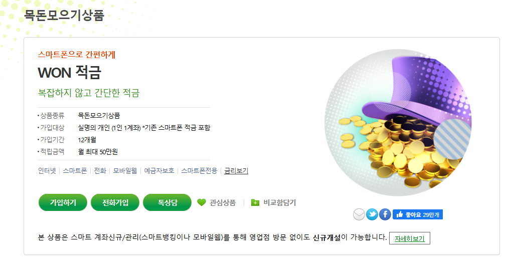 복잡하지 않고 간단한 적금으로 쉽고 빠르게 할 수 있는 장점이 있는 적금입니다.