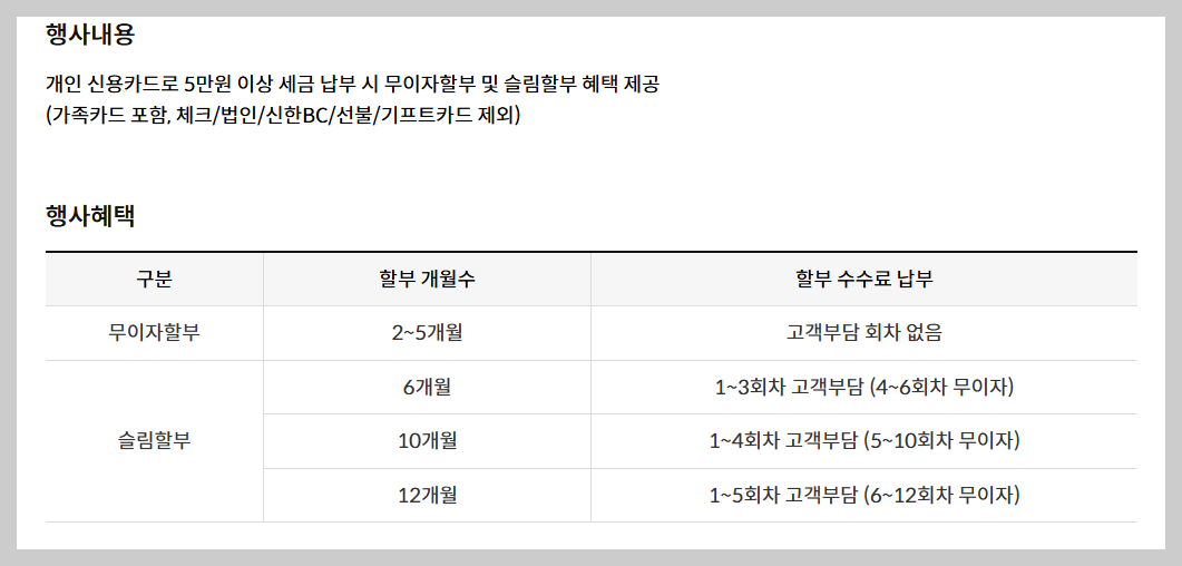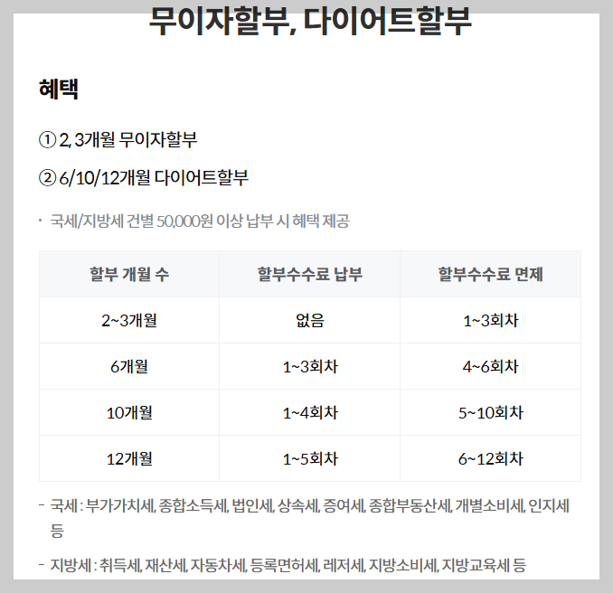 국세,지방세가 2,3개월 무이자 혜택을 받을 수 있으며 10개월, 12개월은 부분수수료 면제의 혜택이 주어집니다. 10개월은 1~4회차 까지 부분수수료가 붙으며 5~10회차는 수수료가 면제입니다. 12개월은 1~5회차는 수수료가 붙고 6~12개월은 면제입니다.