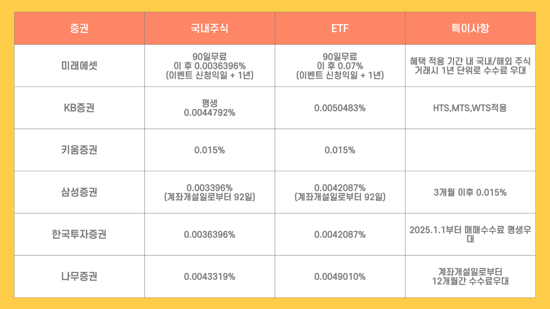 2025.1.1부터 매매수수료 평생 우대로 국내주식은 0.0036396% , ETF는 0.0042087%입니다.