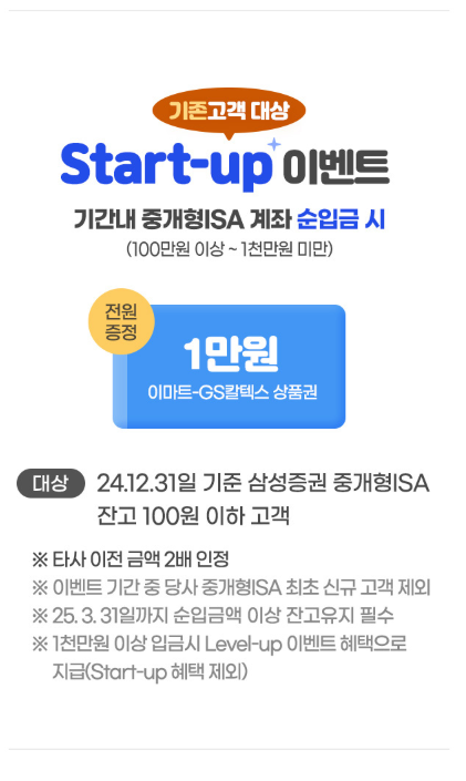 대상 : 24.12.31 기준 삼성증권 중개형 ISA 잔고 100원 이하고객이 25.3.31일까지 잔고 100만 원 이상 유지 시