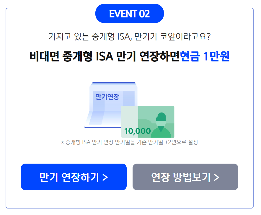 혜택 : 비대면 중개형 ISA 신규개설 시 현금 1만 원 지급
