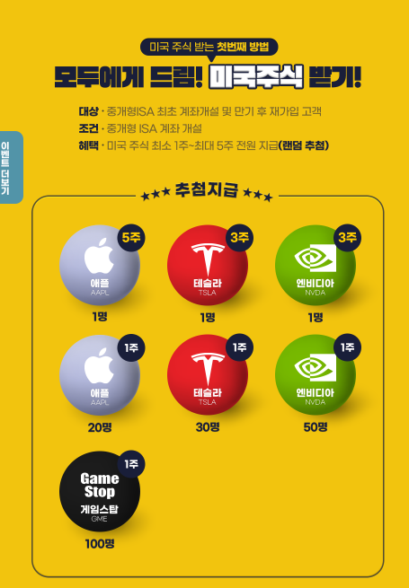 | 키움증권 | 이벤트 1 대상 : 계좌 개설 및 재가입 고객전원 조건 : 중개형 ISA 개설 혜택 : 미국 주식 최소 1주 ~ 최대 5주 전원 지급 이벤트 2 대상 : 중개형 ISA / 연금계좌 신규고객 또는 미거래 고객 조건 : 이벤트 기간 내 대상계좌에서 한번 이상 첫 거래 혜택 : 미국 주식 최소 1주 ~ 최대 5주 당첨 시 지급(랜덤 추첨 : 5,000명) 이벤트 3 대상 : 중개형 ISA 계좌 전용 특판 ELB 가입고객 조건 : 100만원 이상 청약 ( 기간 내 합산) 혜택 : 미국 주식 최소 1주 ~ 최대 3주 당첨 시 지급(랜덤 추첨 : 1,000명) |