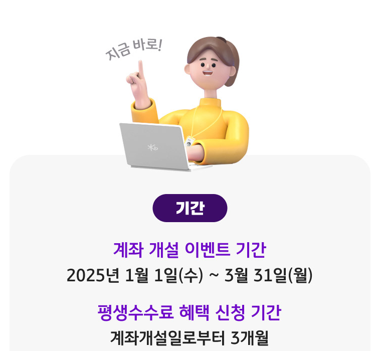 | KB증권 | 이벤트 1 기간 : 2025.1월1일 (수) ~ 3월31일 (월) 대상 : 이벤트 기간 중 온라인으로 중개형 ISA 개설 후 이벤트 신청한 고객 적용매체 : MTS,HTS,WTS 혜택 : 평생 수수료 지원 |