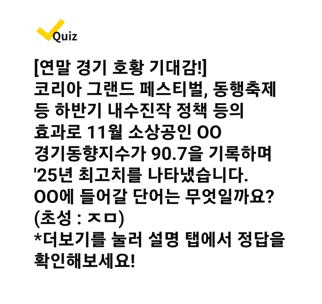 캐시워크 11월 20일 퀴즈 정답 안내해 드리도록 하겠습니다. 오늘은 소상공인과 함께하는 연말 캐시적립으로 정부에서 진행되는 동행축제를 진행합니다. 11월 30일까지 전국 온/오프라인 대박 할인 찬스이므로 꼭 확인하시고 퀴즈도 풀고 쇼핑도 즐겨 보시기를 바랍니다.