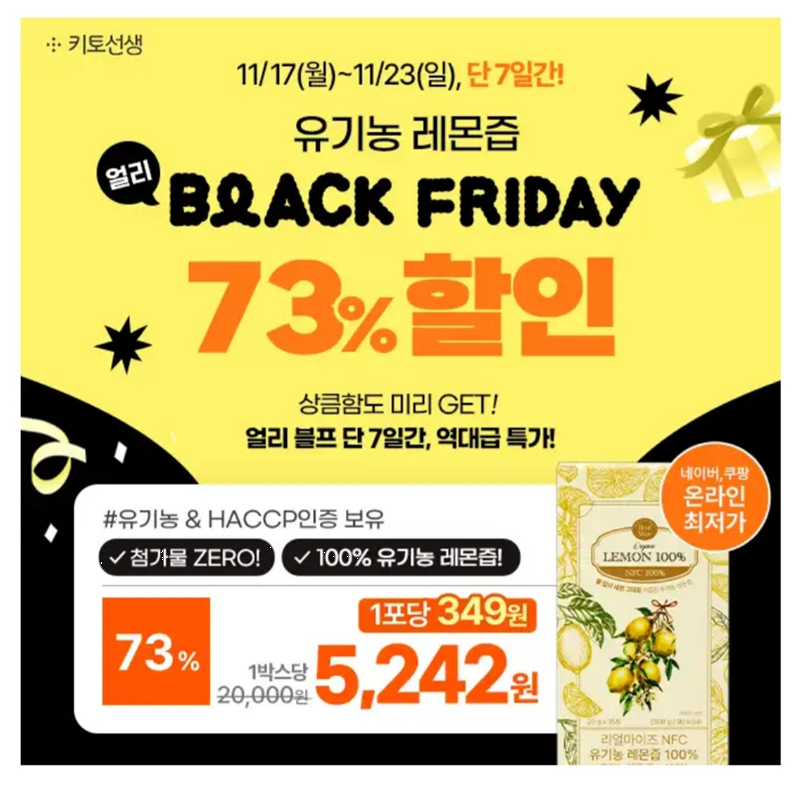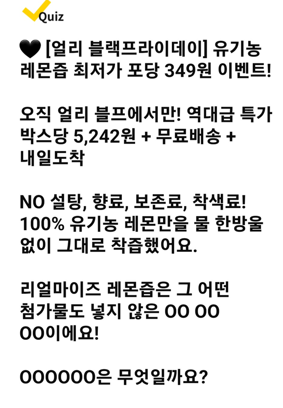 [얼리 블랙프라이데이] 유기농 레몬즙 최저가 포당 349원 이벤트! 오직 얼리 블프에서만 역대급 특가 박스당 5,242원 + 무료배송 + 내일 도착 NO 설탕, 향료, 보존료, 착색료! 100% 유기농 레몬만을 물 한 방울 없이 그대로 착즙 했어요. 리얼마이즈 레몬즙은 그 어떤 첨가물도 넣지 않은 000000이에요 000000은 무엇일까요?