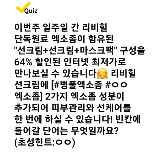 이번 주 일주일 간 리비힐 단독우너료 엑소좀이 함유된 " 선크림+선크림+마스크퍅"구성을 64% 할인된 인터넷 최저가로 만나보실 수 있습니다. 리비힐 선크림에 [#병풀엑소좀#OO엑소좀] 2가지 엑소좀 성분이 추가되어 피부관리와 선케어를 한 번에 하실 중 있습니다! 빈칸에 들어갈 단어는 무엇일까요?