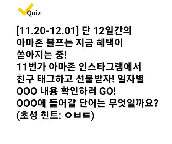 [11/20 ~ 12.01] 단 12일간의 아마존 블프는 지금 혜택이 쏟아지는 중! 11번가 아마존 인ㅇ스타그램에서 친구 태그하고 선물받자! 일자별OOO 내용 확인하러 GO! OOO에 들어갈 단어는 무엇일까요?