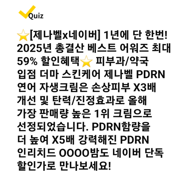 캐시워크 11월 24일 정답 안내하겠습니다. 제나벨과 네이버가 뭉쳤습니다. 1년에 단 한번! 2025년 베스트 크림 부분에 PDRN 리쥬비네이팅 자생크림이 선정되었습니다. 이번 퀴즈의 정답을 맞히시고 진정크림 구매에도 할인을 많이 받아보시기 바랍니다. 네이버 단독으로 할인가를 만나실 수 있습니다.