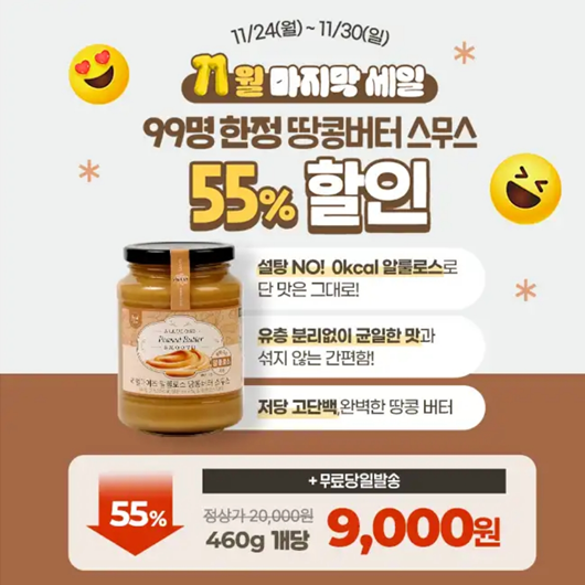 11월 마지막 세일 99명 한정 땅콩버터 스무스 55% 할인