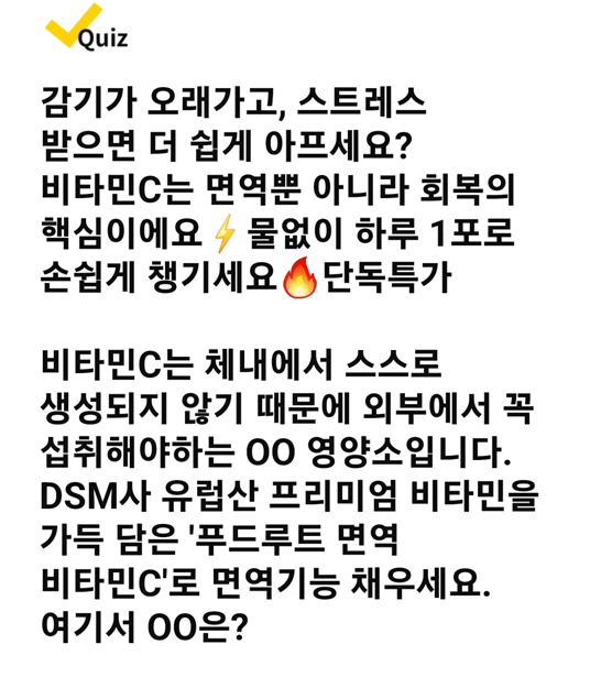 캐시워크 11월 26일 돈 버는 퀴즈 정답 안내하겠습니다. 비타민 C와 관련된 퀴즈입니다. C는 몸에서 못 만들어요. 필수 영양소인 비타민 C는 면역뿐 아니라 회복할 수 있는 영양소입니다. 비타민 C와 아연이 합쳐서 항산화와 면역기능을 위한 영양제가 나왔습니다. 하루 한 포로 건강도 챙기고 퀴즈 정답을 맞혀 포인트도 얻어가시기 바랍니다.