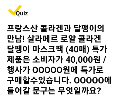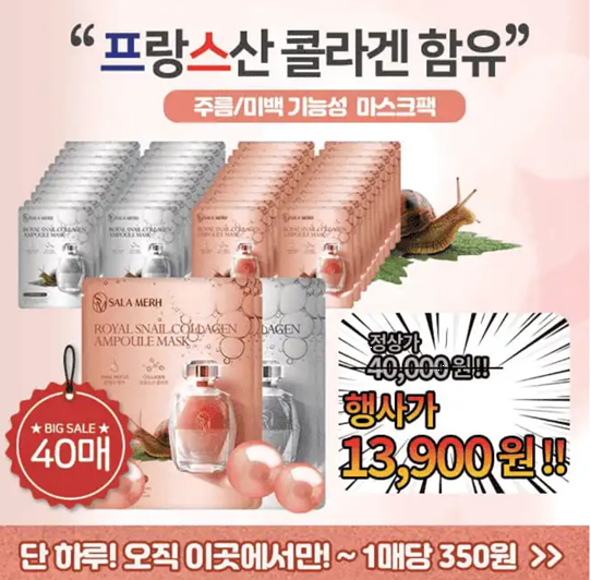 캐시워크 11월 27일 돈 버는 퀴즈 정답 안내하겠습니다. 프랑스산 콜라겐과 달팽이콜라겐 마스크팩을 만날 수 있습니다.살라메르 스킨케어에서 로얄 스네일 콜라겐 앰플 마스크를 할인하고 있습니다. 달팽이 점액질에 포함되어 있는 뮤신, 알란토인, 콜라겐등이 피부로 흡수되어 거칠어짐 예방과 개선에 도움을 줍니다.