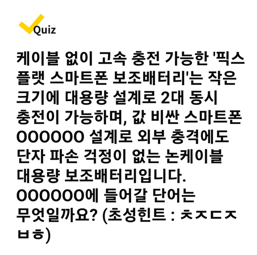 Q : 케이블 없이 고속 충전 가능한 '픽스 플랫 스마트폰 보조배터리'는 작은 크기에 대용량 설계로 2대 동시 충전이 가능하며, 값 비싼 스마트폰 00000 설계로 외부 충격에도 단자 파손 걱정이 없는 논케이블 대용량 보조배터리 입니다. 000000에 들어갈 단어는 무엇일까요?