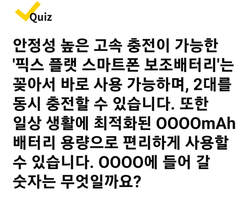 Q : 안정성 높은 고속 충전이 가능한 '픽스 플랫 스마트폰 보조배터리'는 꽂아서 바로 사용 가능하며, 2대를 동시 충전할 수 있습니다. 또한 일상 생활에 최적화된 0000mAh 배터리 용량으로 편리하게 사용할 수 있습니다. 0000에 들어갈 숫자는 무엇일까요?
