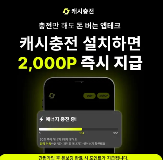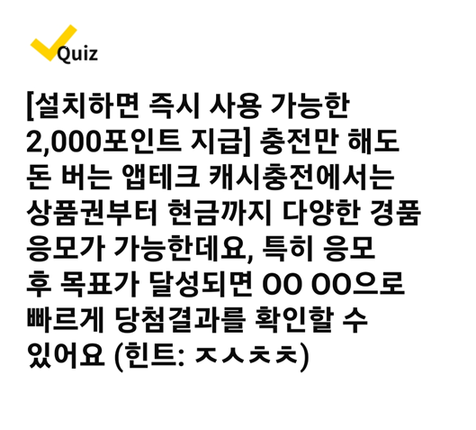 Q : 설치하면 즉시 사용 가능한 2,000 포인트 지급 충전만 해도 돈 버는 앱테크 캐시충전에서는 상품권부터 현금까지 다양한 경품 응모가 가능한데요, 특히 응모 후 목표가 달성 되면 00 00으로 빠르게 당첨결과를 확인할 수 있어요.