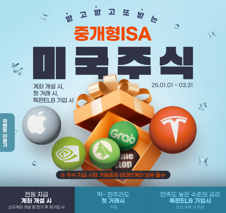 ISA에 대한 말도 많은 하루였네요. 그래도 아직까지 믿고 보는 ISA 계좌입니다. 노후를 위해서 뭐라도 세금이 적은 계좌를 가지고 있어야 합니다. 연금저축이나 IRP 같은 경우는 55세 이상이 되어야 받을 수 있습니다. 그 생각하면 언제 받지? 재미도 없고 너무나도 먼 얘기 같아서 와닿지 않는 분들이 많을 수 있습니다. 그래서 ISA 매력이 더욱 있는 게 아닌 가 싶습니다. 그래서 부담 없이 나의 미래를 위해 투자하면서 3년 납입하고 비과세 받는 계좌를 더욱 관심 있게 보게 됩니다. 오늘은 키움증권에서 ISA 가입 시 이벤트를 한다고 해서 가져와 봤습니다.