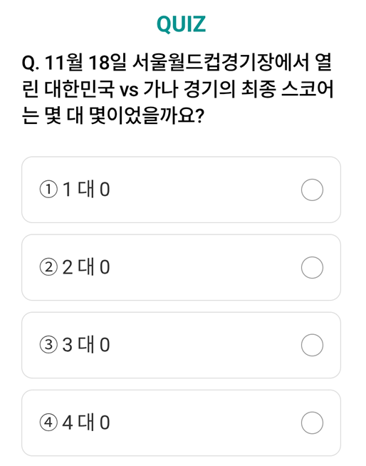 Q : 11월 18일 서울월드컵 경기장에서 열린 대한민국 VS 가나 경기의 최종 스코어는 몇 대 몇이었을까요?
