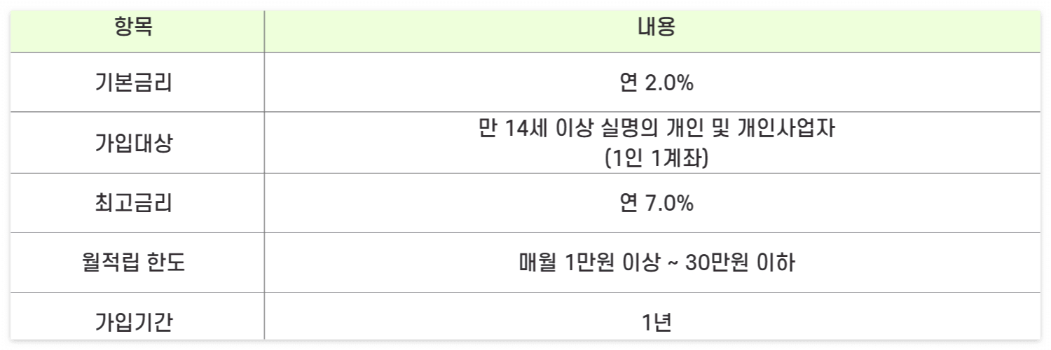 상품은 만 14세 이상 실명의 개인 및 개인사업자도 가능합니다. 1인 1 계좌를 사용합니다. 기본금리는 2.0%이며 최고 금리는 연 7%입니다. 월 적립한도가 매월 1만 원 이상 ~ 30만 원 이하로 1년간 가입기간을 유지합니다.