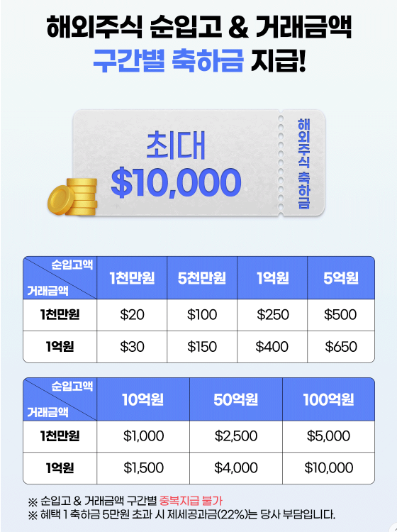 ① 해외주식 순 입고 & 거래금액 구간별 축하금 지급!