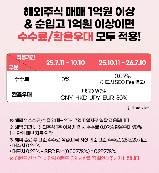 ② 해외주식 매매 1억 원 이상 & 순입금 1억원 이상이면 수수료/환율우대 모두 적용합니다.
