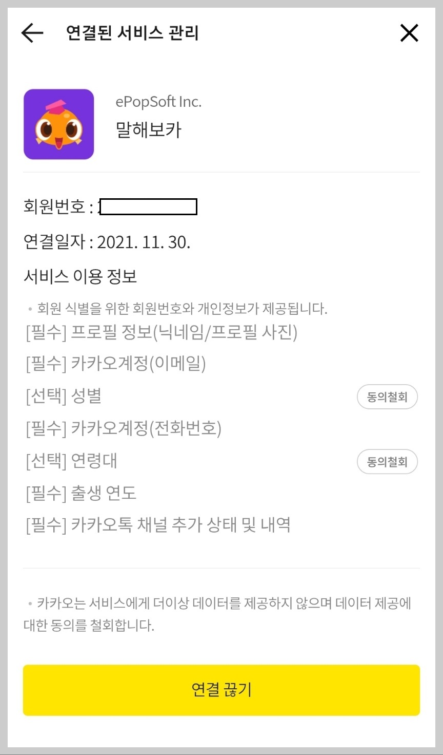 ⑥ 하나 눌러봤더니 말해보카 사이트였네요. 연결일자와 서비스 이용 정보를 확인하실 수 있어요. 동의를 철회하시려면 연결 끊기를 진행하시면 됩니다.