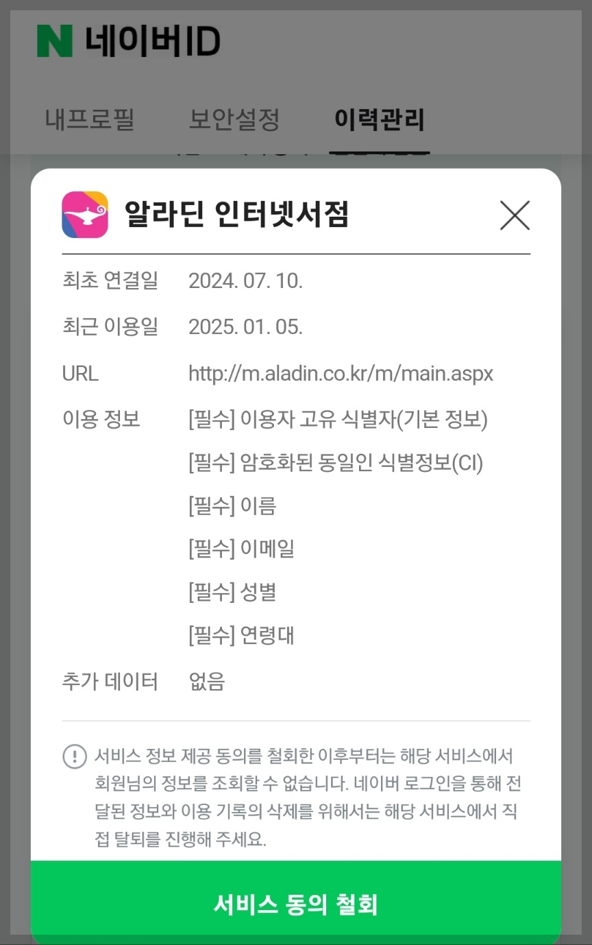 ④ 예로 들면 제가 알라딘 인터넷 서점 사이트에 동의를 했습니다.