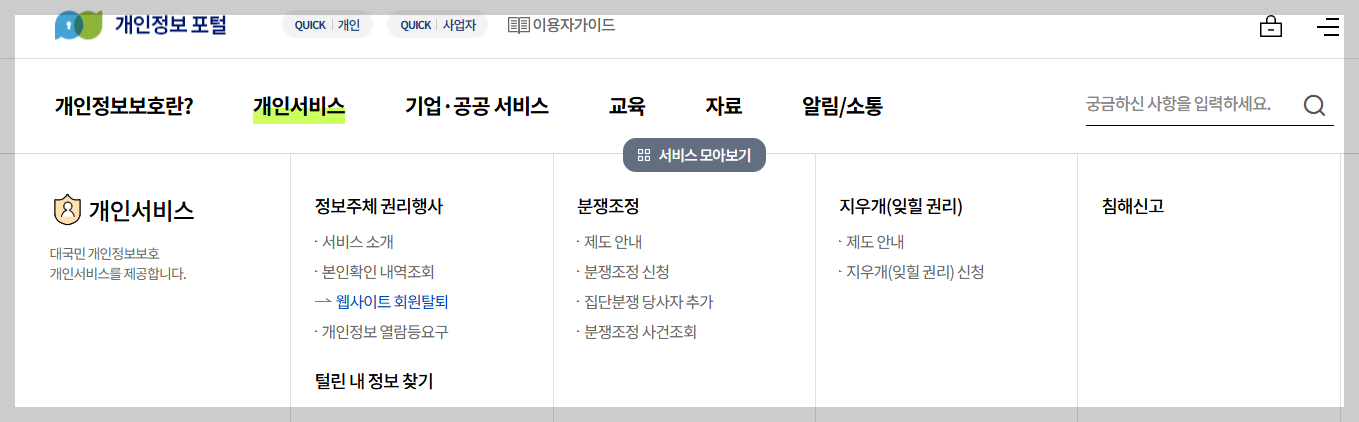 ② 개인서비스에서 본인확인 내역 조회 --> 웹사이트 회원탈퇴를 클릭합니다.