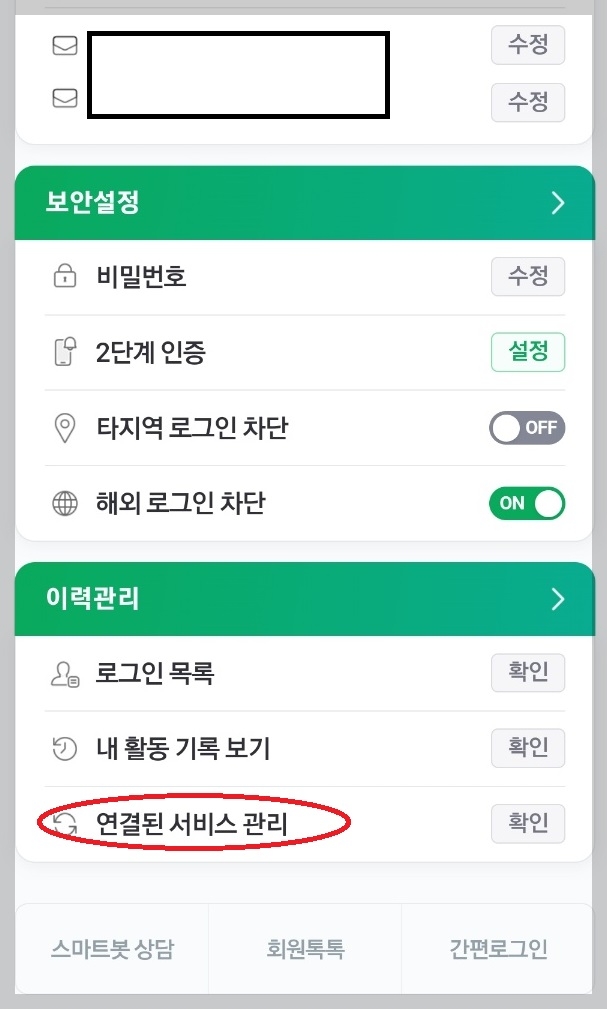 ③카카오계정에 들어가시면 계정연결에 연결된 서비스 관리가 있습니다.