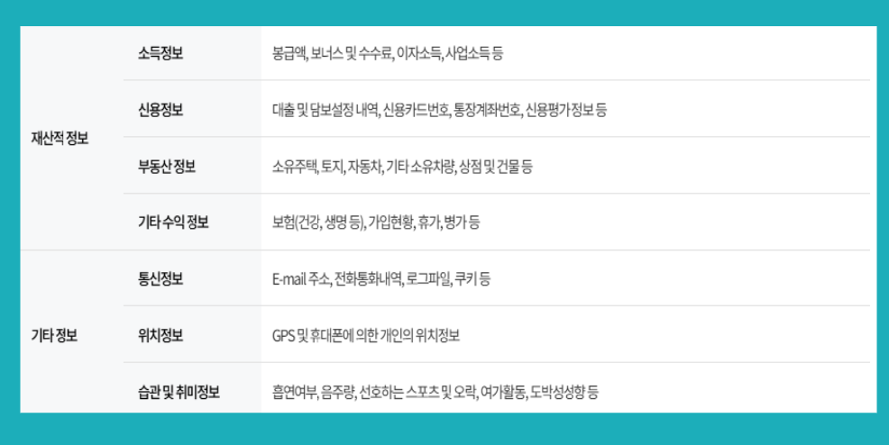 • 재산적 정보 - 소득정보, 신용정보, 부동산정보, 기타 수익정보