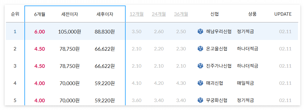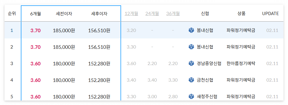 1위는 3.7% 봄내신협이며 1,000만 원 예치 시 6개월에 세후이자 156,510원을 받으실 수 있습니다.