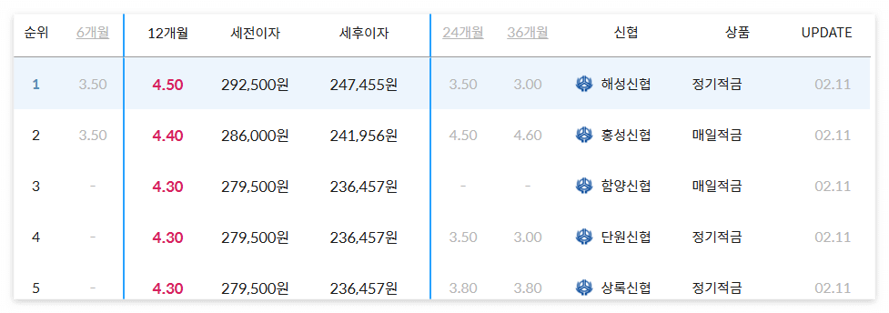 대구수성신협(유니온정기예탁금, 정기예탁금), 서원주신협(유니온정기예탁금, 정기예탁금)으로 1윌부터 4위까지 차지하고 있습니다. 세후 이자는 300,330원입니다. 5위는 남서울신협으로 3.52%인 세후이자 297,792원입니다.