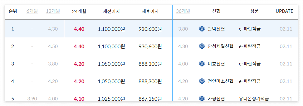 관악신협, 안성제일이 동일하게 4.4% 로 세후이자 930,600원입니다. 미호, 천안미소신협은 888,300원 세후 이자를 받습니다. 4.1% 가평신협은 세후이자 867,150원입니다.