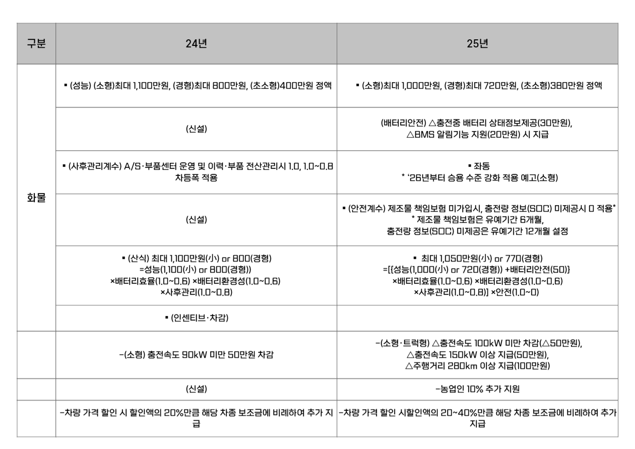 소형, 트럭형은 충전속도 100kW 미만 차감, 150kW 이상 지급(50만 원), 주행거리 280만 원 이상 지급(100만 원)이며 농업인은 10% 추가 지원이 신설되었습니다.
