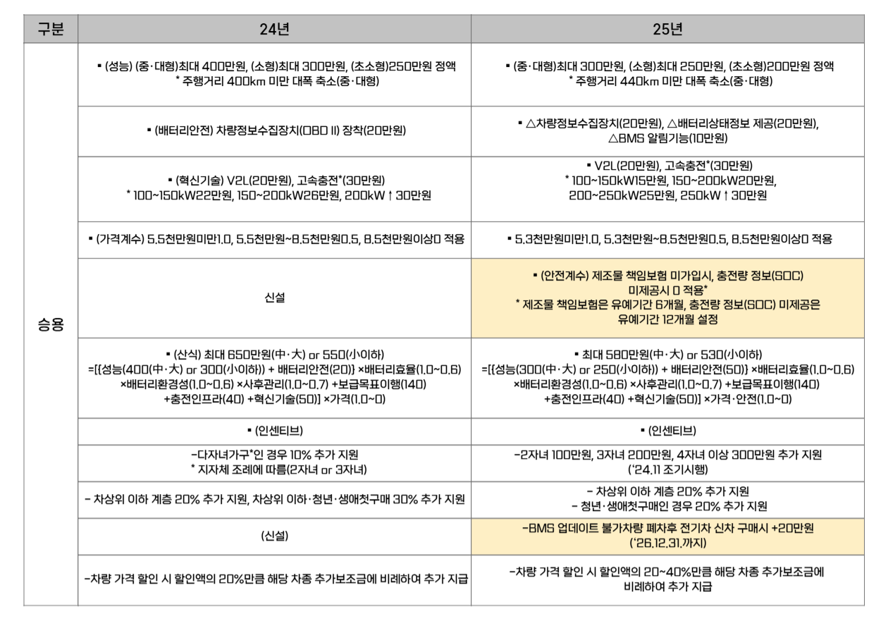 안전계수는 신설로 제조물 책임보험 미가입 시, 충전량 정보 미제공시 보조금을 미지급하며, 배터리 관리 시스템 업데이트가 불가능한 차는 폐차 후 전기차로 구매 시 추가 보조금을 지원합니다.